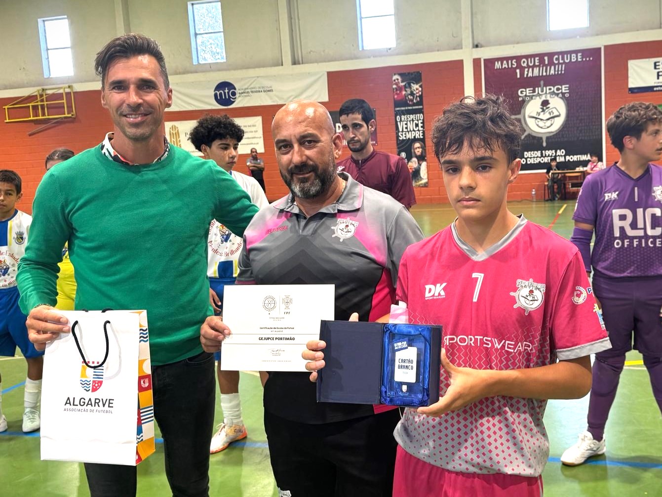 Rodrigo Lima, atleta do GEJUPCE, recebeu esta semana a distinção da Associação de Futebol do Algarve (AFA) por ter visto um cartão branco durante um jogo da 1ª jornada da Liga Algarve Futsal Iniciados, frente ao ADC “Os Lagoenses”. O prémio foi entregue por Miguel Boto, vice-presidente da AFA.