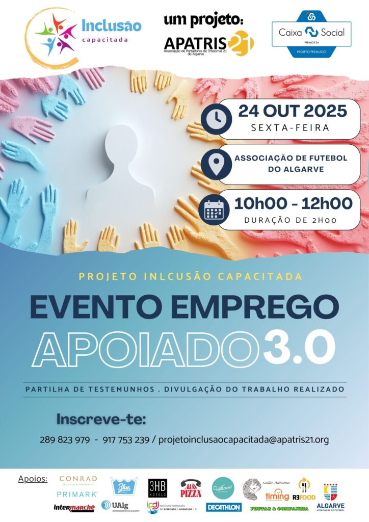 A sede da Associação de Futebol do Algarve, em Faro, vai receber um seminário sobre Emprego Apoiado, organizado pela APATRIS21 – Associação de Portadores de Trissomia 21 do Algarve, que tem como objetivo promover a inclusão profissional de pessoas com deficiência e/ou outras dificuldades de inserção no mercado de trabalho. Com data marcada para o dia 24 de outubro, entre as 10 e as 12 horas, esta ação tem uma duração aproximada de duas horas. Os interessados devem inscrever-se através do email projetoinclusaocapacitada@apatris21.org ou do contacto telefónico 289823979 / 917753239.