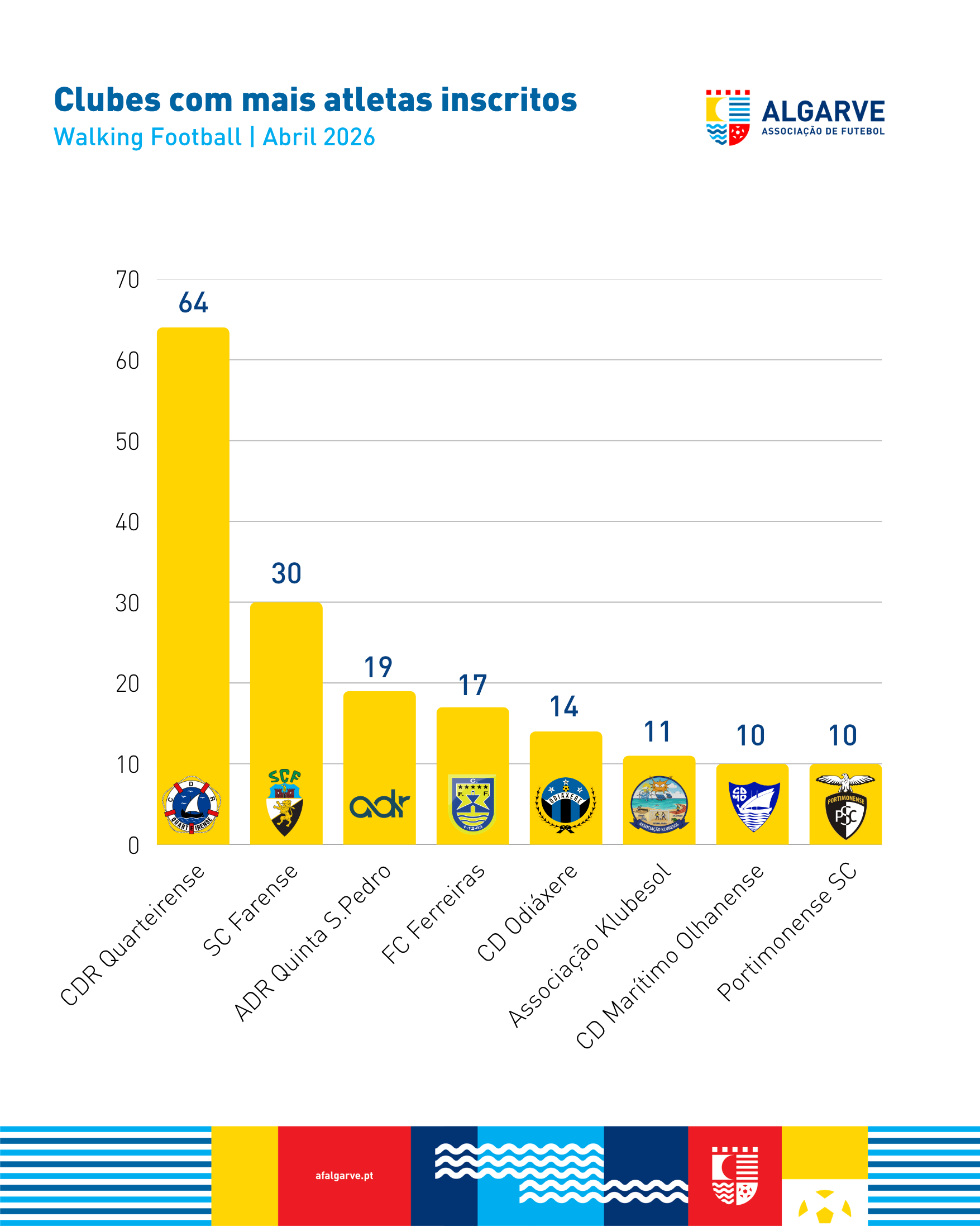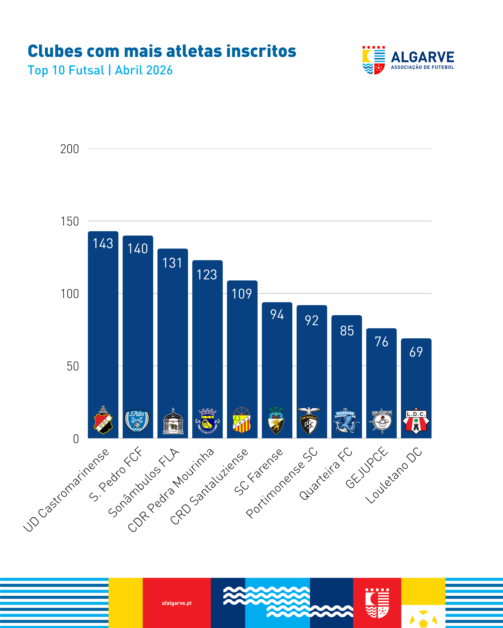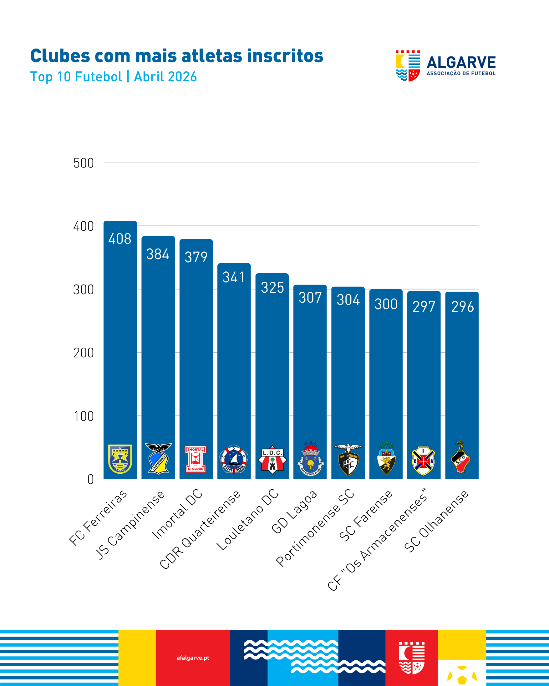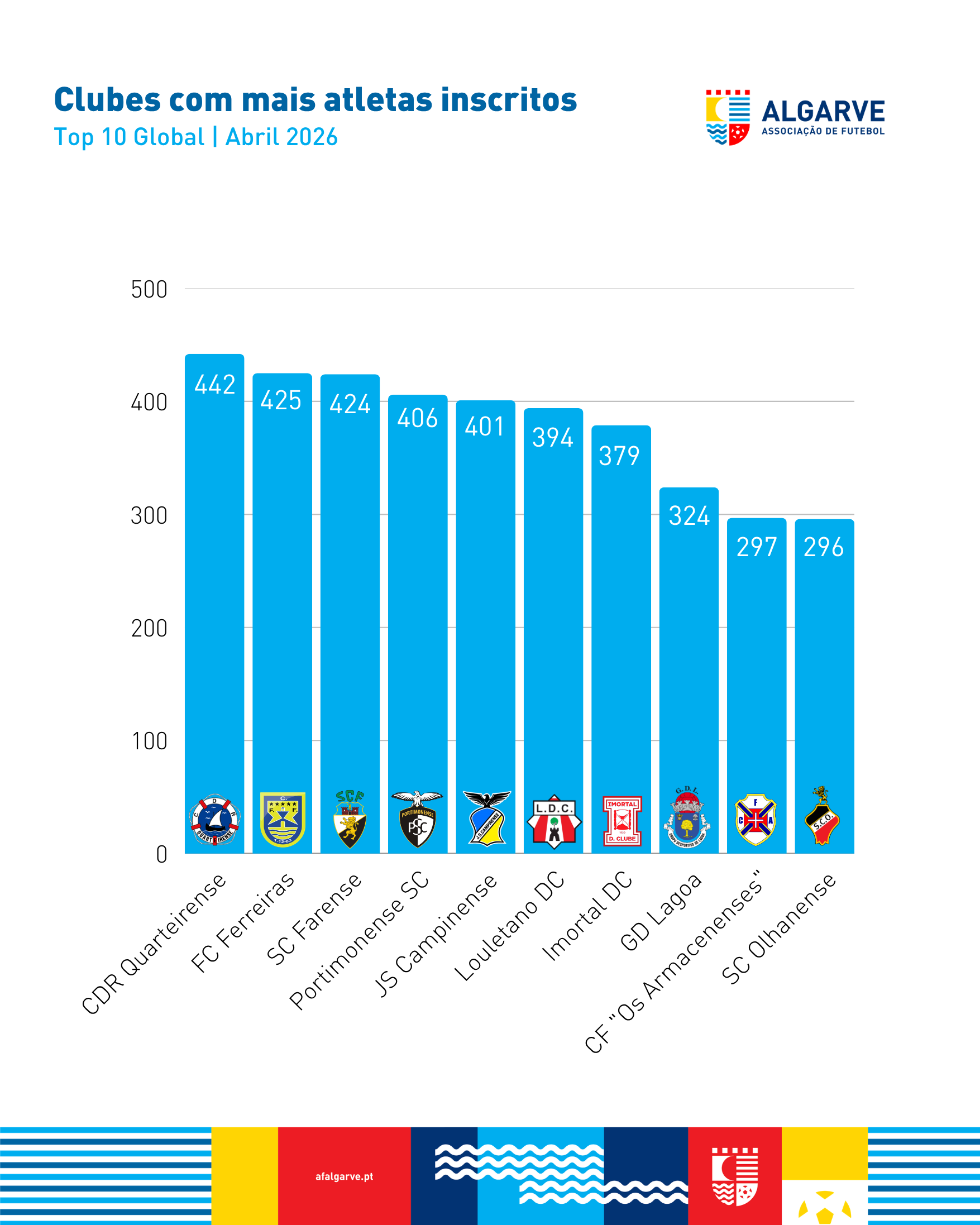A Associação de Futebol do Algarve divulga a lista dos 10 clubes com mais atletas inscritos desde o início da presente época desportiva até ao final do mês de abril de 2026.