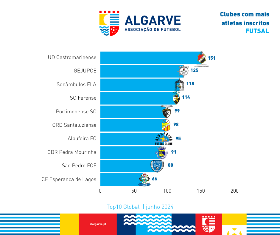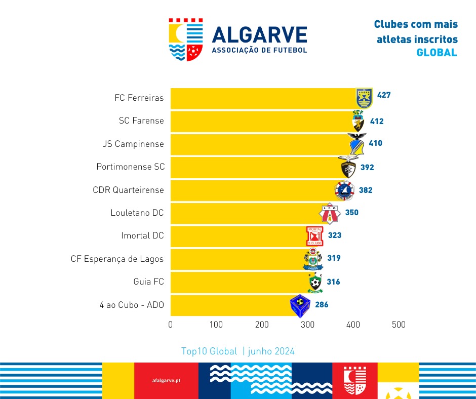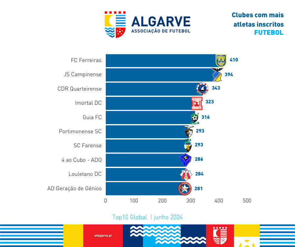 A Associação de Futebol do Algarve divulga a lista dos clubes com mais atletas inscritos desde o início da presente época desportiva até ao dia 17 de junho de 2024.