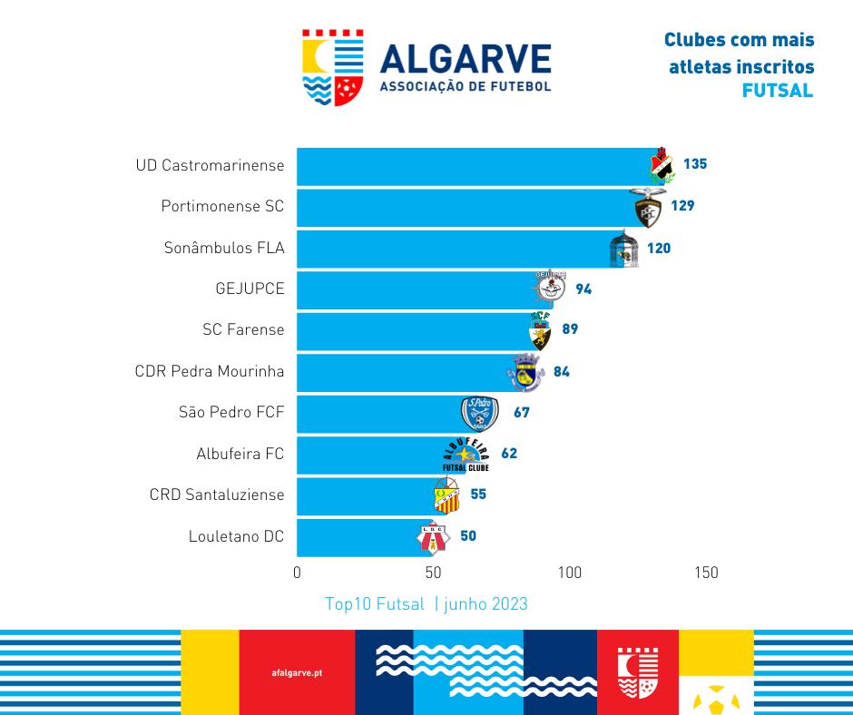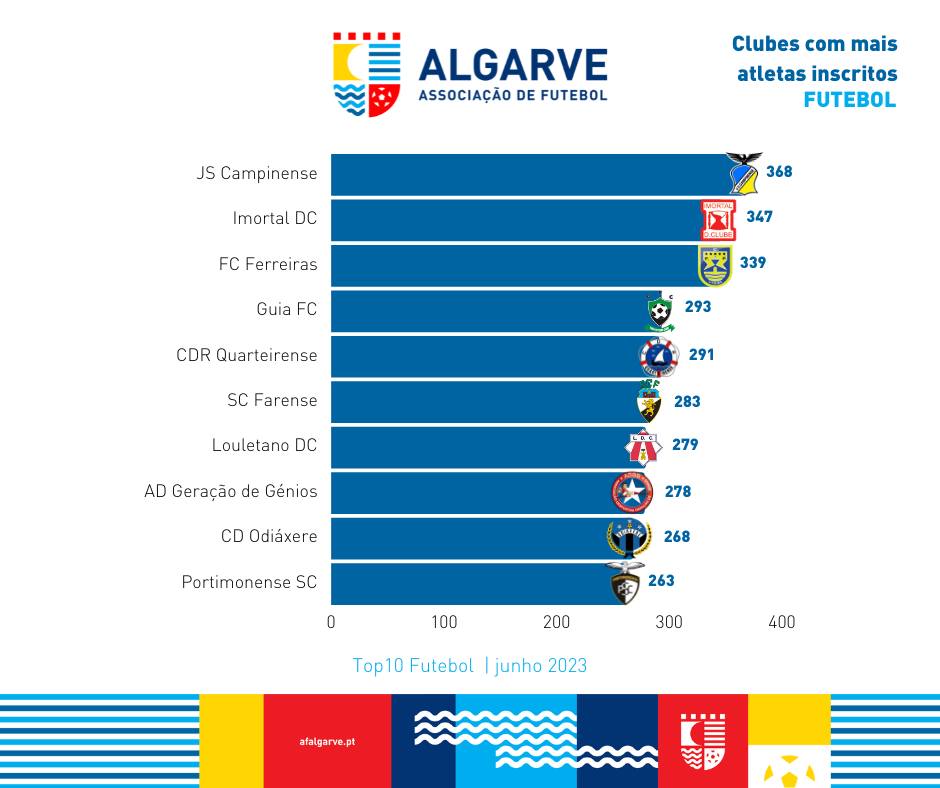 A Associação de Futebol do Algarve divulga a lista dos clubes com mais atletas inscritos desde o início da presente época desportiva até ao dia 30 de maio de 2023.