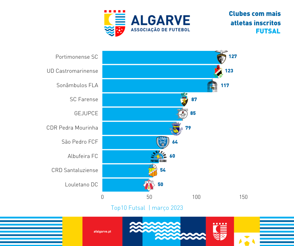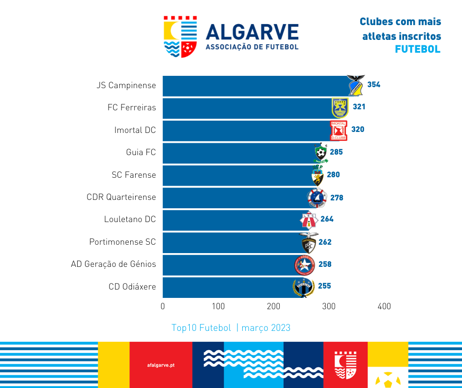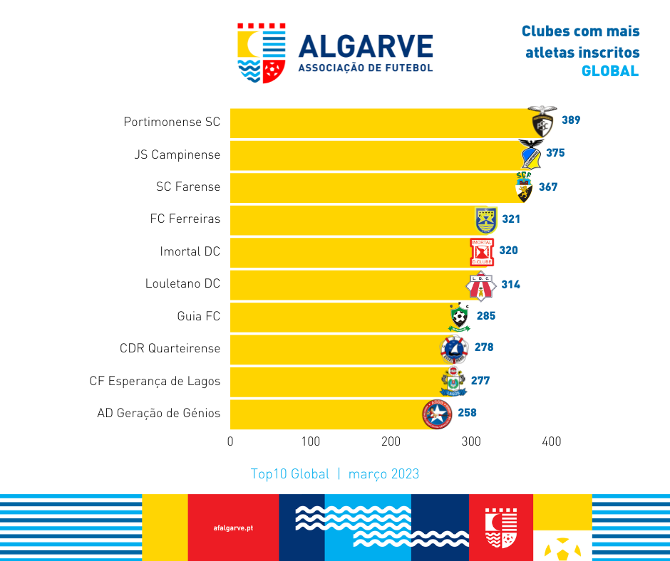 A Associação de Futebol do Algarve divulga a lista de 10 clubes com mais atletas inscritos desde o início da presente época desportiva até ao dia 28 de fevereiro de 2023.