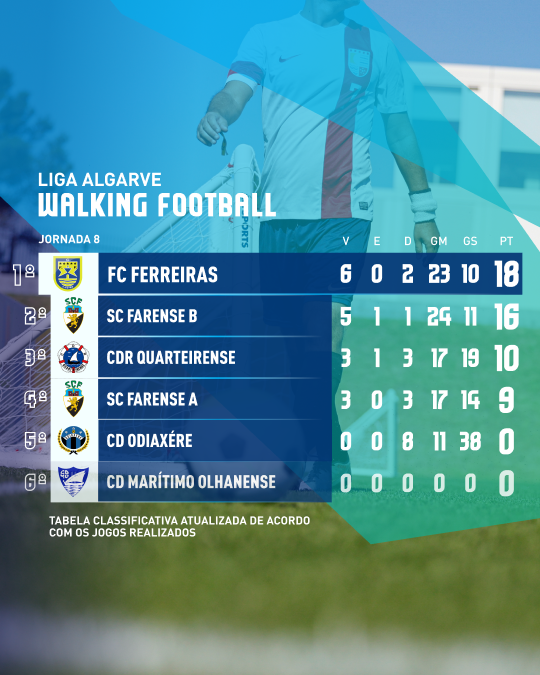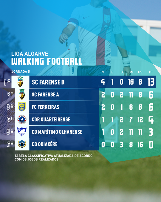 A Associação de Futebol do Algarve divulga a tabela classificativa da Liga Algarve Walking Football 25/26.