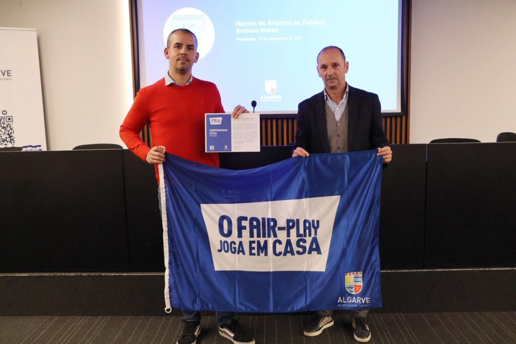 O Núcleo de Árbitros de Futebol António Matos, representado pelo Presidente João Tangarrinha, o Núcleo de Árbitros de Futebol do Sotavento Algarvio, pelo Presidente Daniel Martins, e o Núcleo de Árbitros de Futebol José Filipe, pelo Presidente Cristiano Pires, assinaram os respetivos compromissos éticos, num marco importante para o desenvolvimento da campanha, que nos lembra que o respeito e a ética não pertencem apenas aos campos mas acompanham-nos em qualquer lugar.